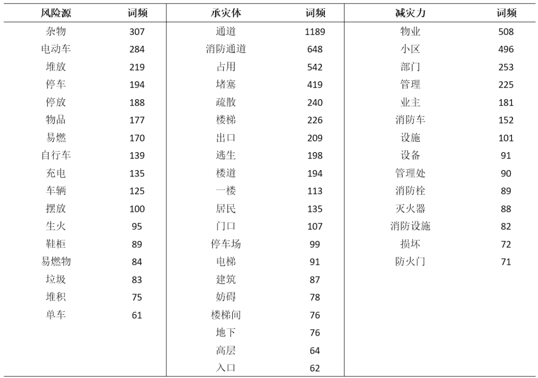 在城市安全“风险源-承灾体-减灾力”理论体系中[16],风险源主要是指造成城市安全事件的要素,承灾体主要指承受城市安全风险事件作用的要素,减灾力主要是指在城市安全风险事件发生前后,能够起到降低灾害影响的效应。基于上述理论,本研究构建了分析火灾隐患风险成因的技术框架(图4)并开展相关研究。在词频分析方面,如表2所示,将文本词频分析得出的高频词汇归纳为风险源、承灾体、减灾力3大类别。风险源方面,高频词汇主要涉及杂物、电动车、易燃物等,反映了杂物堆放、电动车违规充电停放造成的消防隐患和火灾风险。承灾体方面,高频词汇主要涉及消防(疏散)通道、逃生出口、楼道等,反映了各类消防通道面临着安全挑战。减灾力方面,高频词汇主要涉及小区物业、管理部门、消防设施等,反映了消防管理工作、消防设施维护情况等问题。在此基础上,进一步探究火灾隐患背后的主题内容和行为特征。